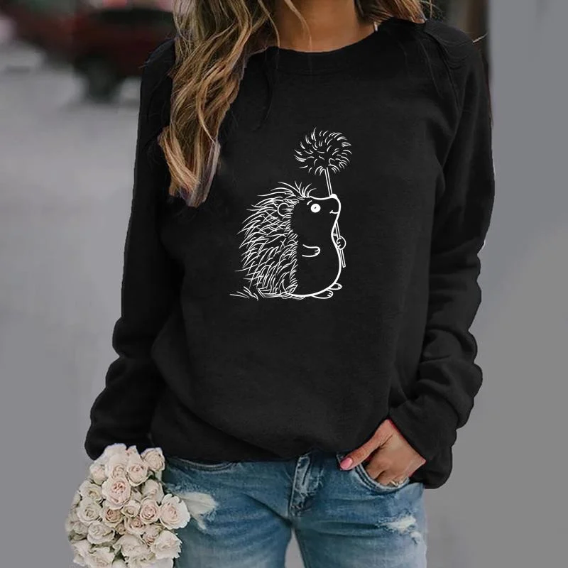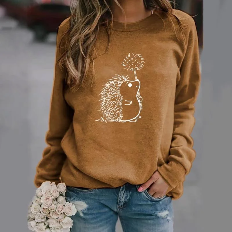Cute Hedgehog Pattern Printed Sweater Women's Fashion Long Sleeve Cozy Crew Neck Pullover Sweatshirt Top