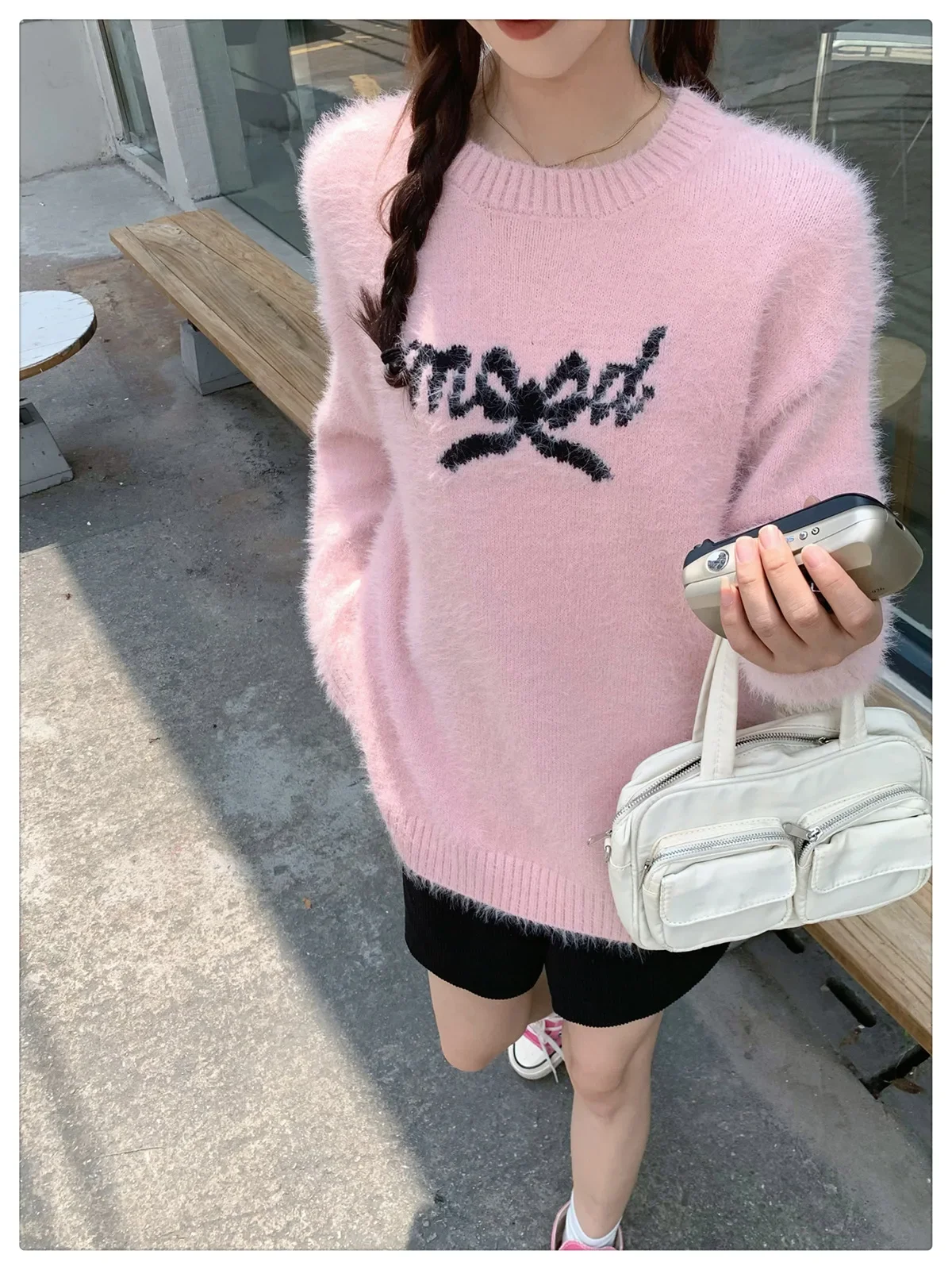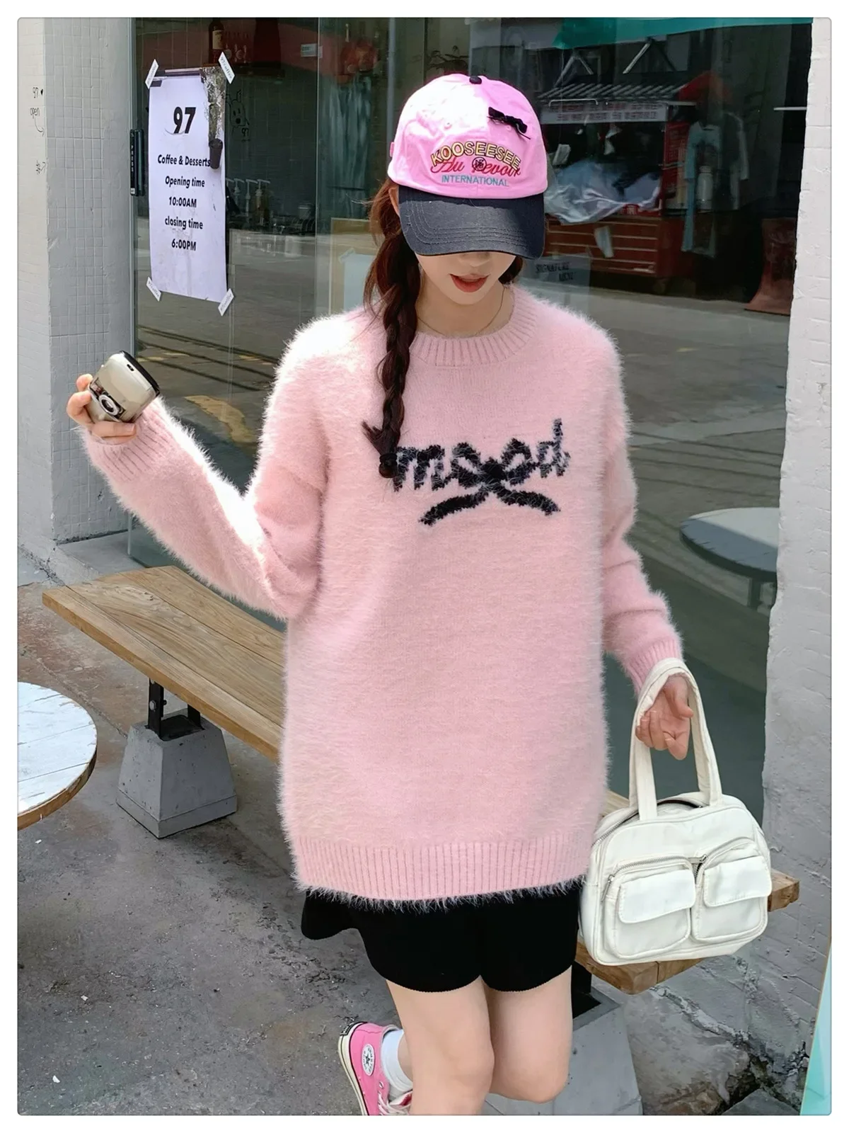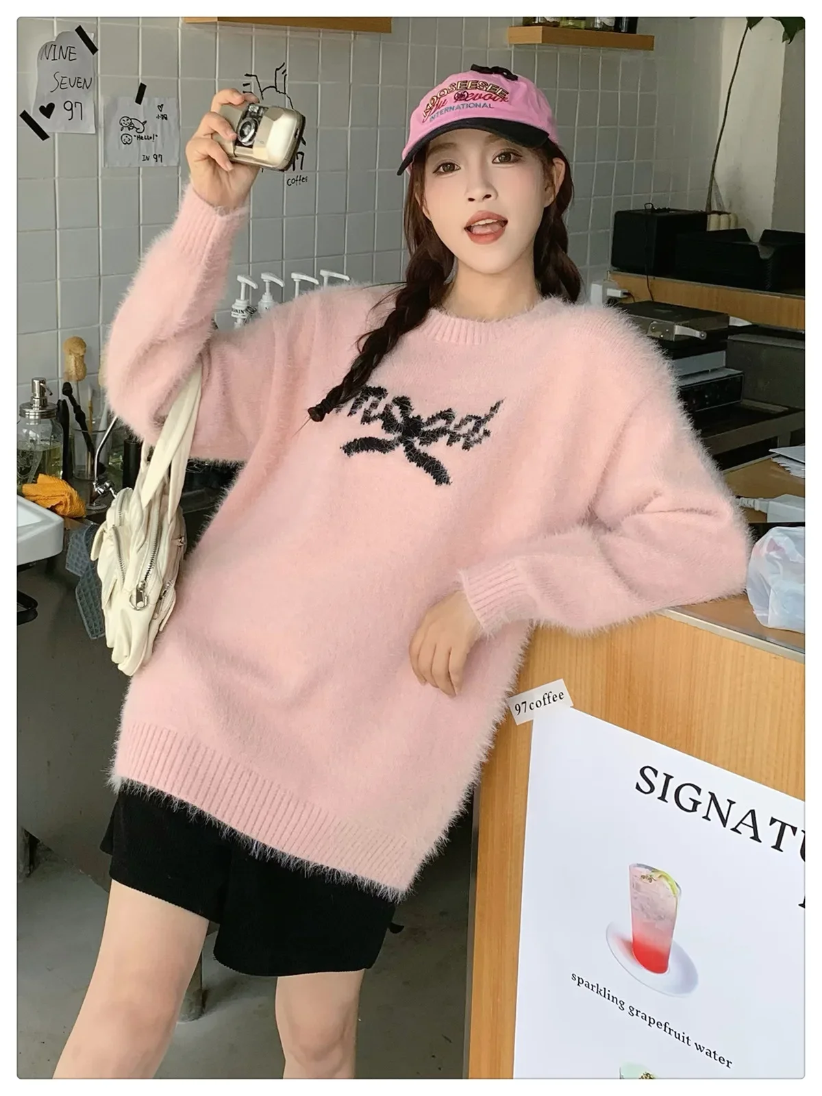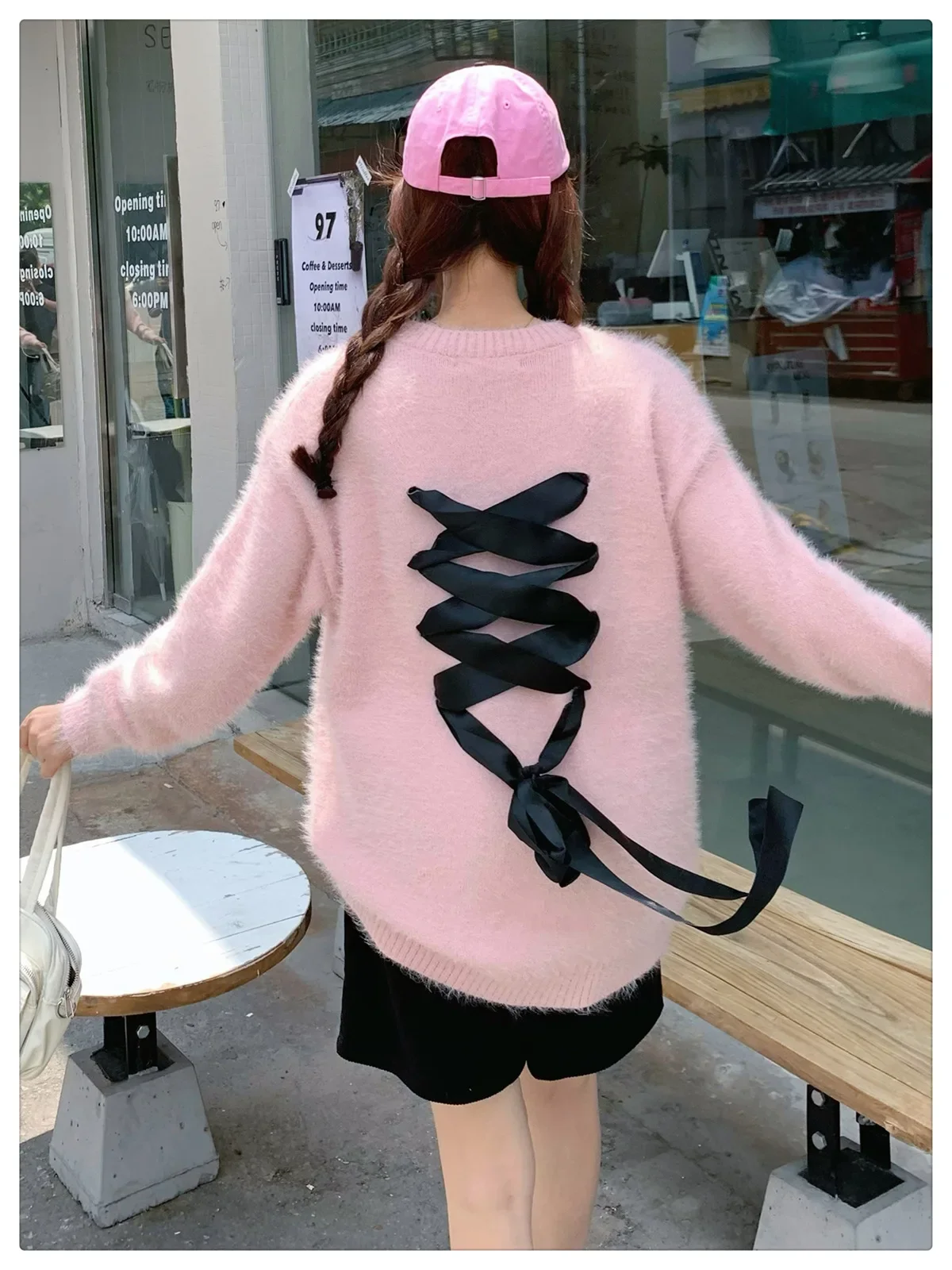 Pink Ribbon Loose Women's Sweater Soft Cozy Autumn Winter Knitwear Sweet Style Casual Wear Crew Neck Other Patterns