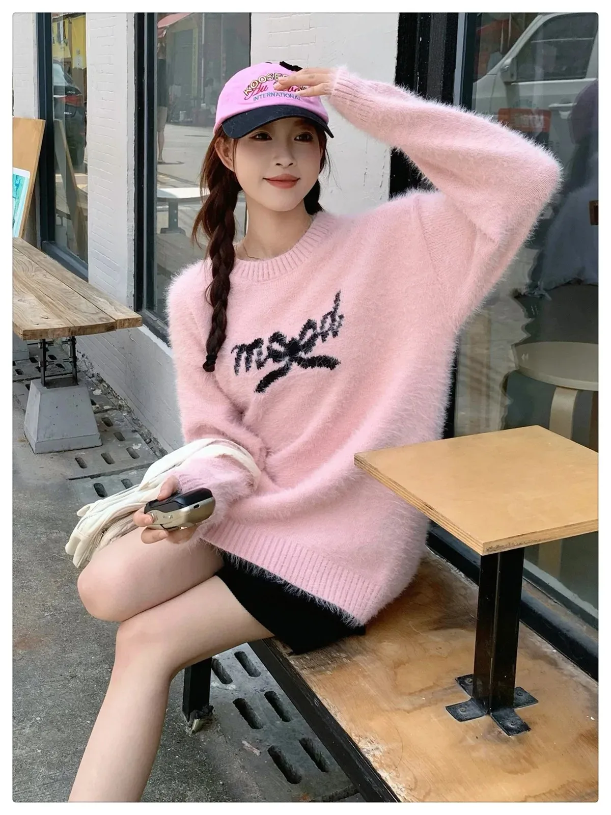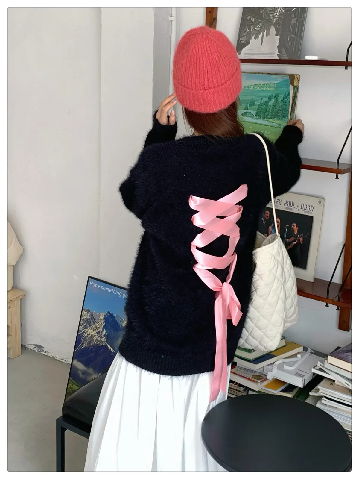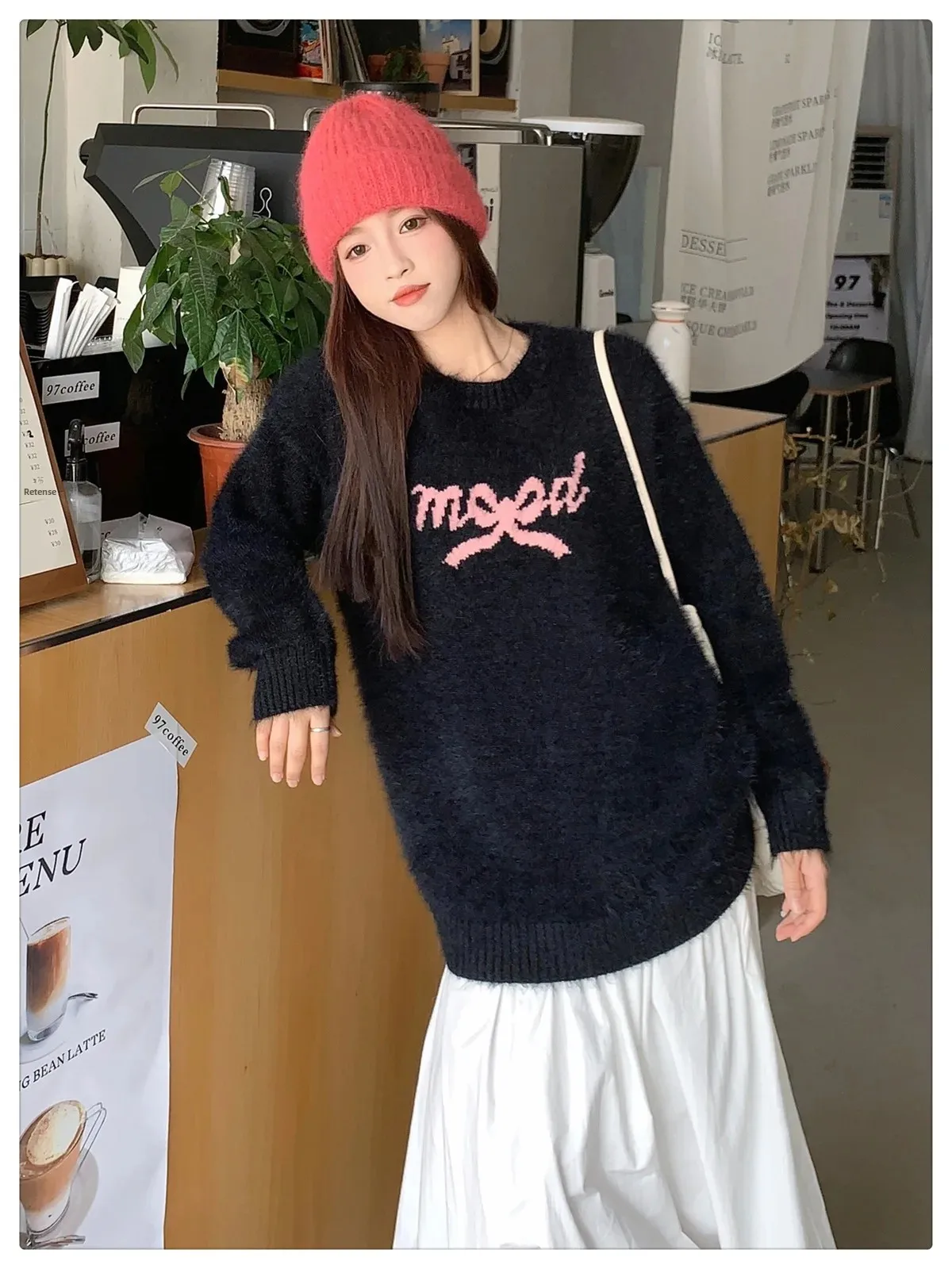Pink Ribbon Loose Women's Sweater Soft Cozy Autumn Winter Knitwear Sweet Style Casual Wear Crew Neck Other Patterns