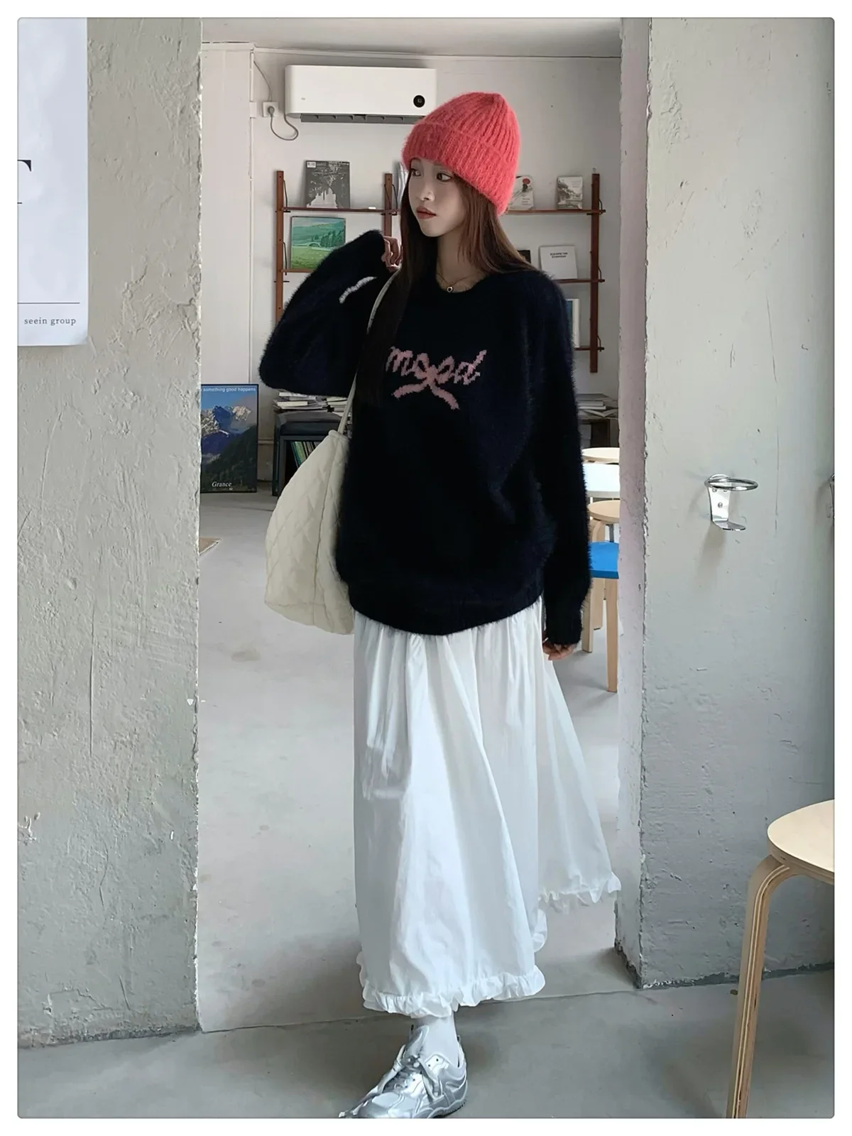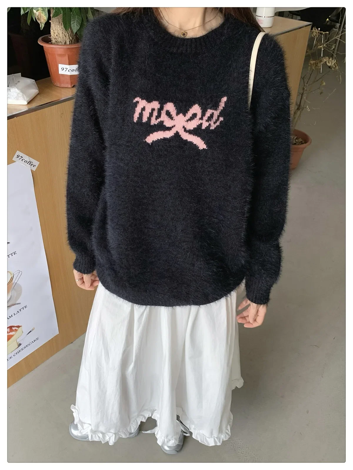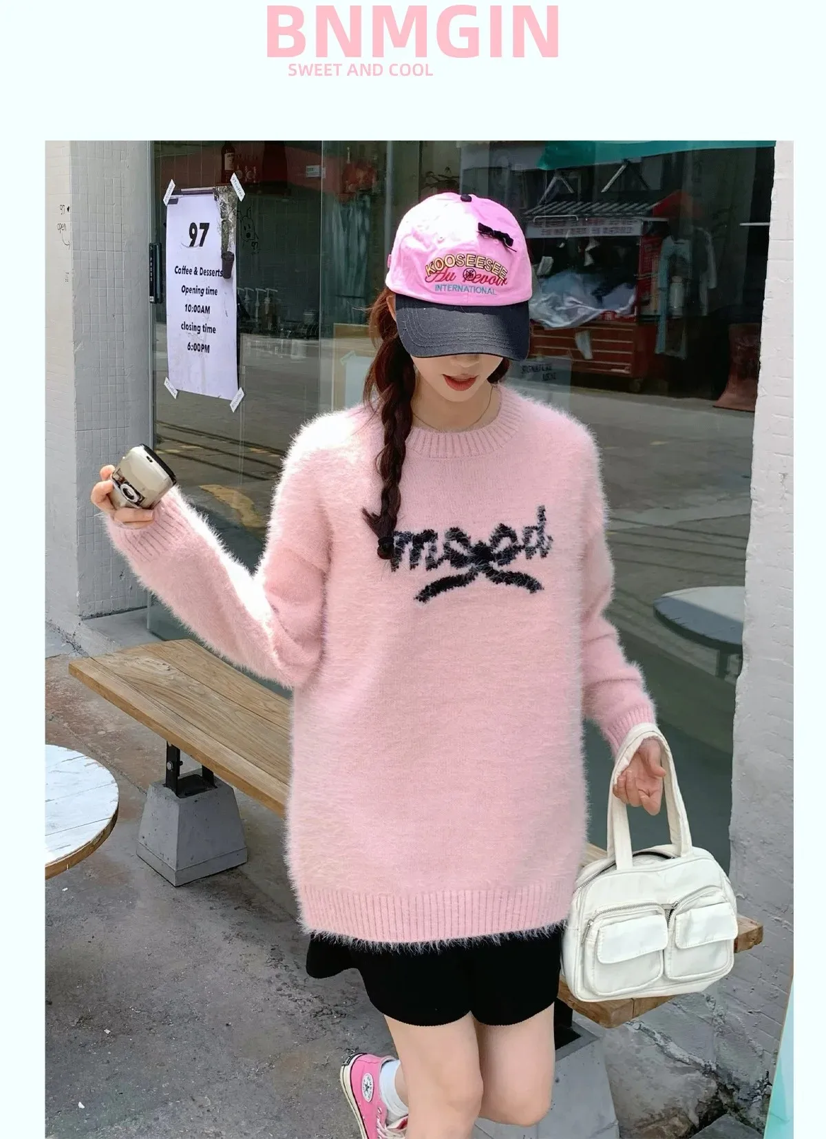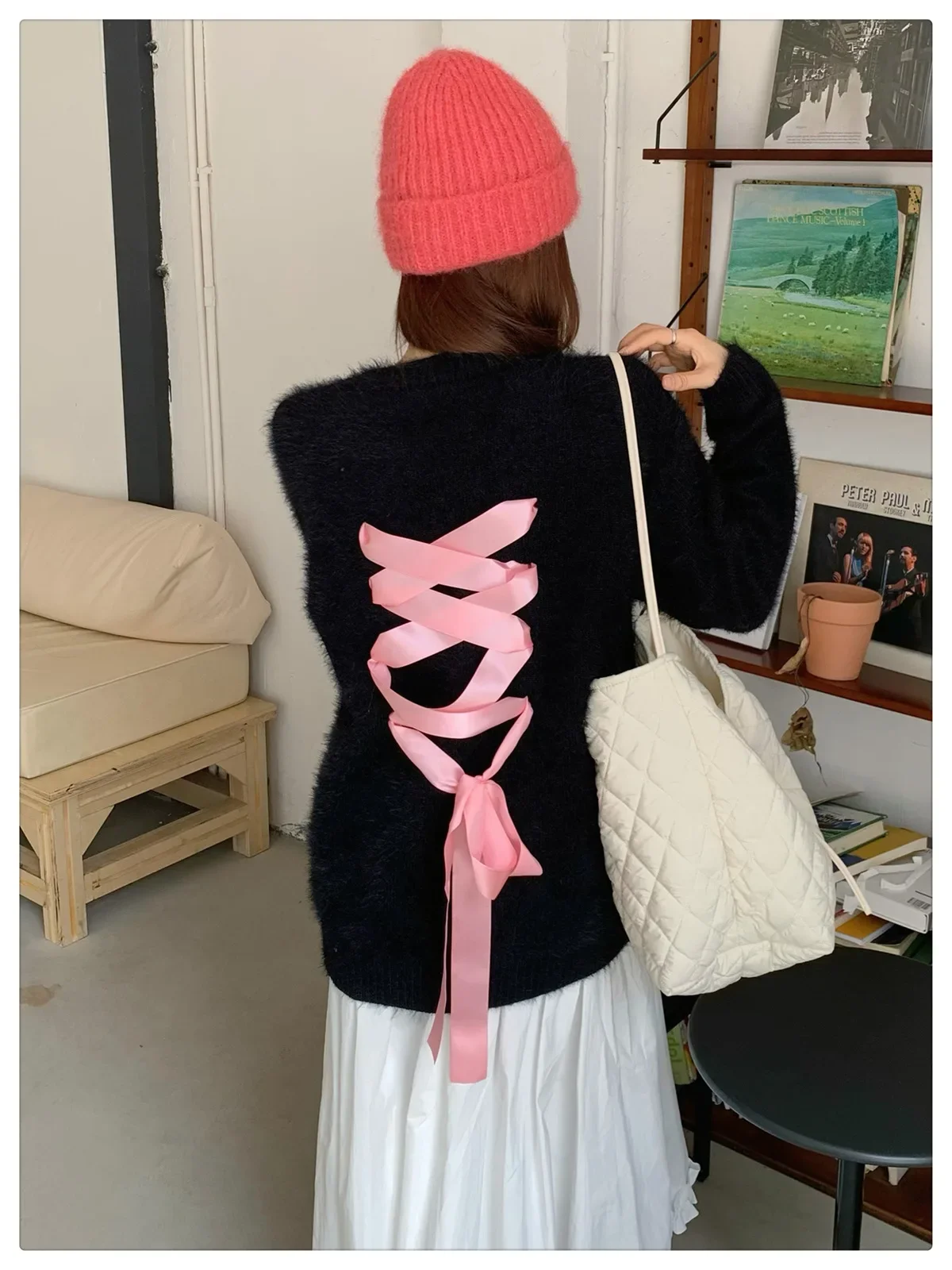 Pink Ribbon Loose Women's Sweater Soft Cozy Autumn Winter Knitwear Sweet Style Casual Wear Crew Neck Other Patterns